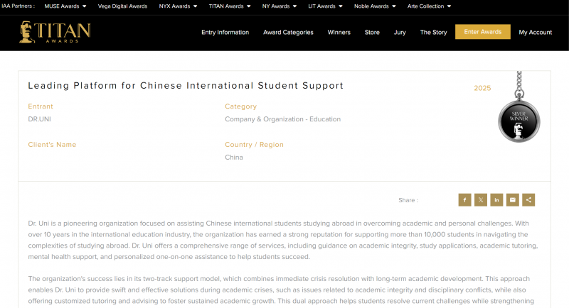 TITAN商业奖作为全球知名的综合性商业类奖项,致力于表彰在各自行业中展现出创新力、影响力和专业能力的企业和机构。此次多博学DR.UNI获奖,不仅是一份荣誉,更是质量、诚信与口碑的象征,意味着多博学DR.UNI在服务流程、案例执行与结果保障方面,已获得国际认可,且在为留学生提供全面支持与精准应对方面能力出众。
